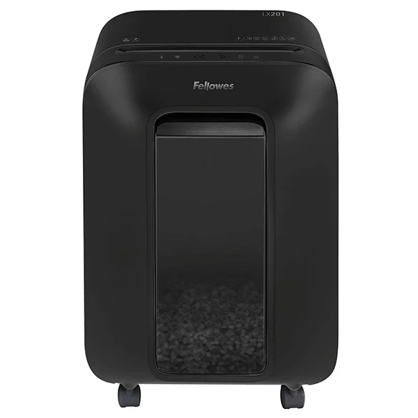 Доступный и безопасный уничтожитель бумаги Fellowes Powershred LX201 для дома и небольшого офиса с компактным белым дизайном, автоматической защитой от перегрева, автоотключением при снятой корзине и поддержкой нарезки бумаги, пластиковых карт, скобок, скрепок